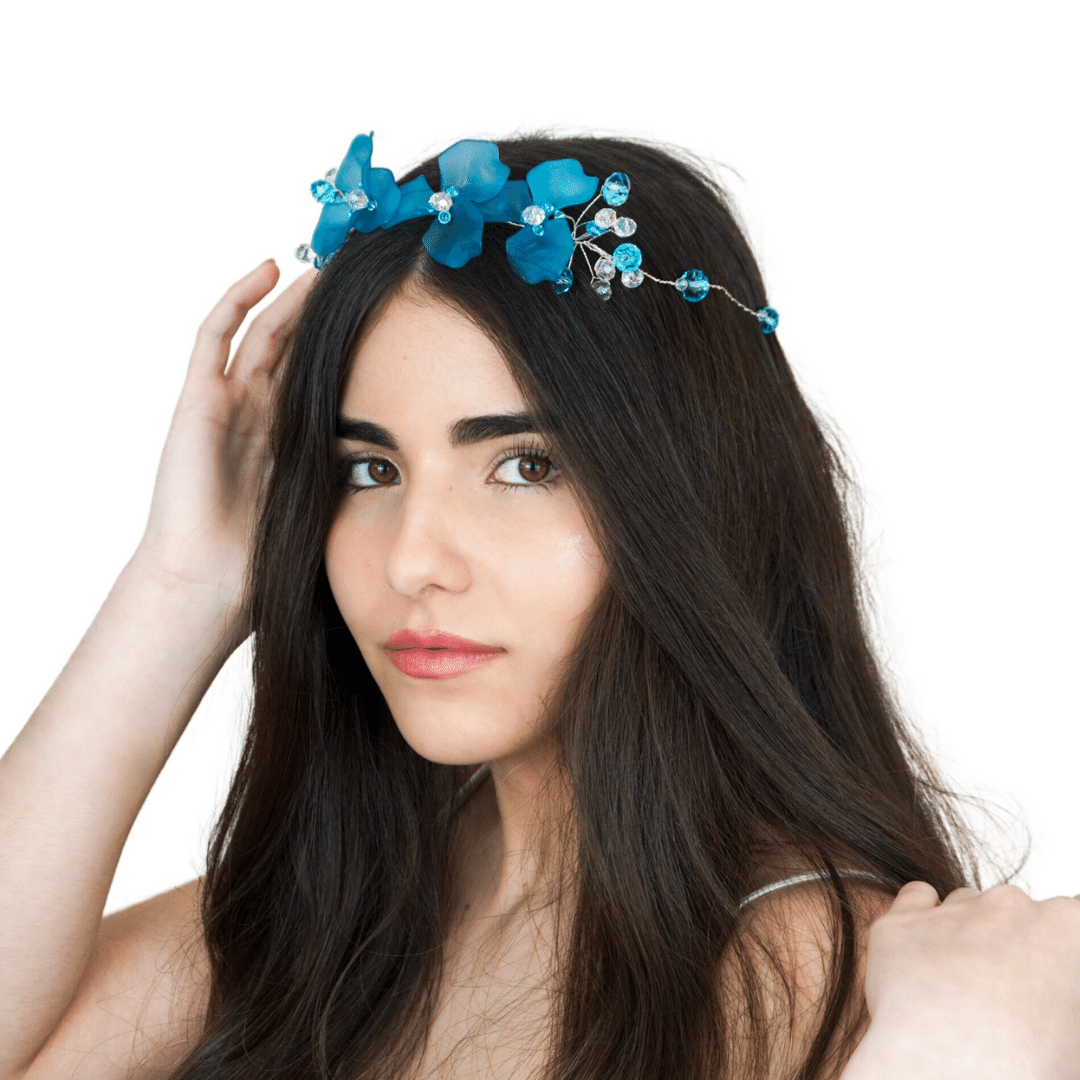 Corona Joya/Floral color azul empolvado con cristal azul y transparente en distintos tamaños . Las piezas van sobre una base metalizada plata. Esta pieza esta diseñada para novia o invitada